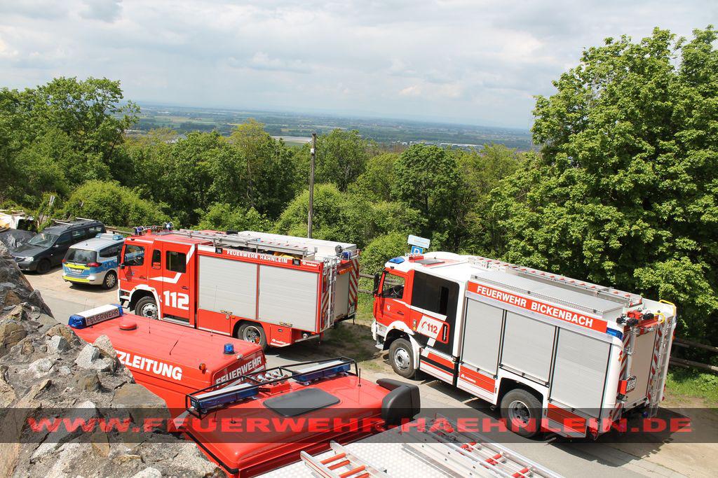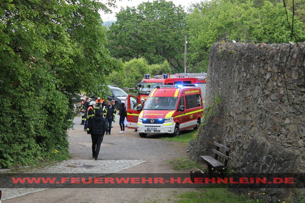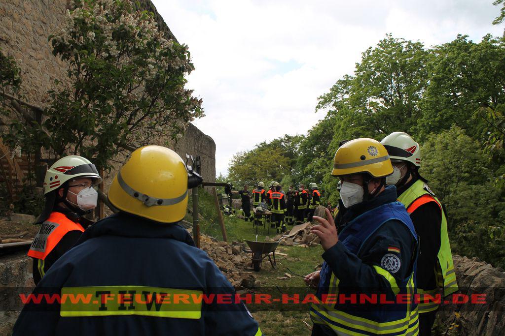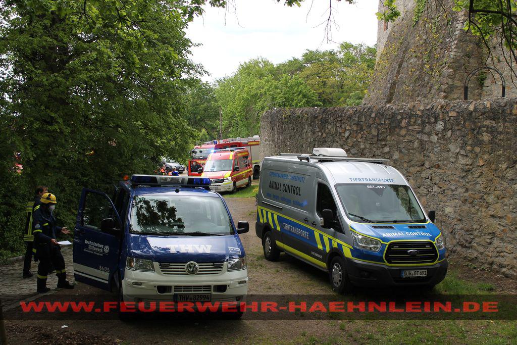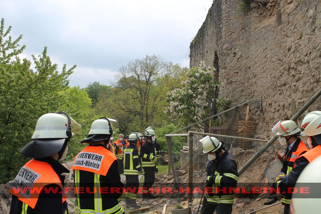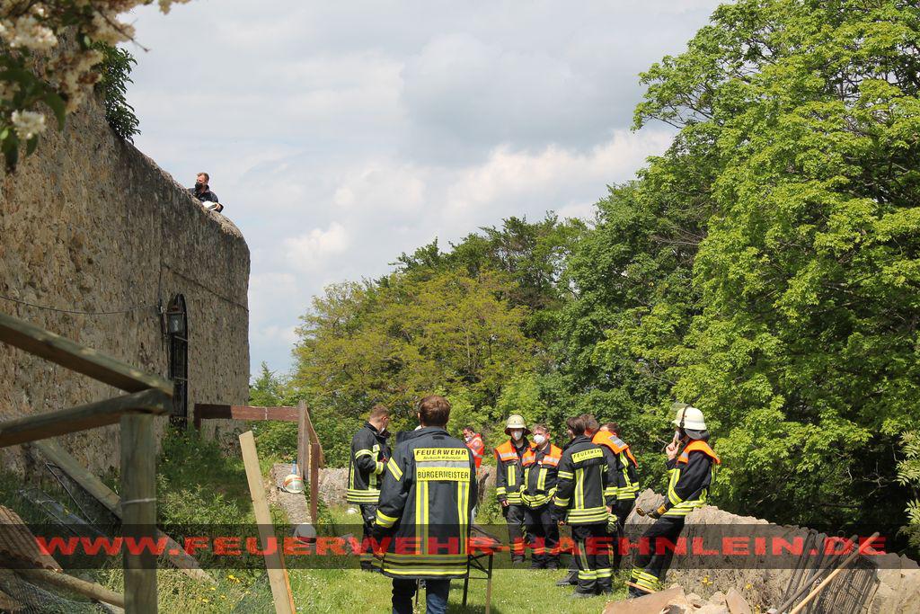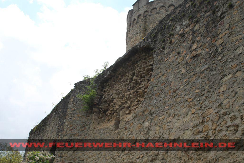 Dort war ein Teilstück der Burgmauer auf ein Hasenstall gestürzt. Da nicht ausgeschlossen werden konnte, das sich noch Personen unter den Trümmern befinden wurde mit dem Stichwort "Menschenleben in Gefahr" alarmiert.